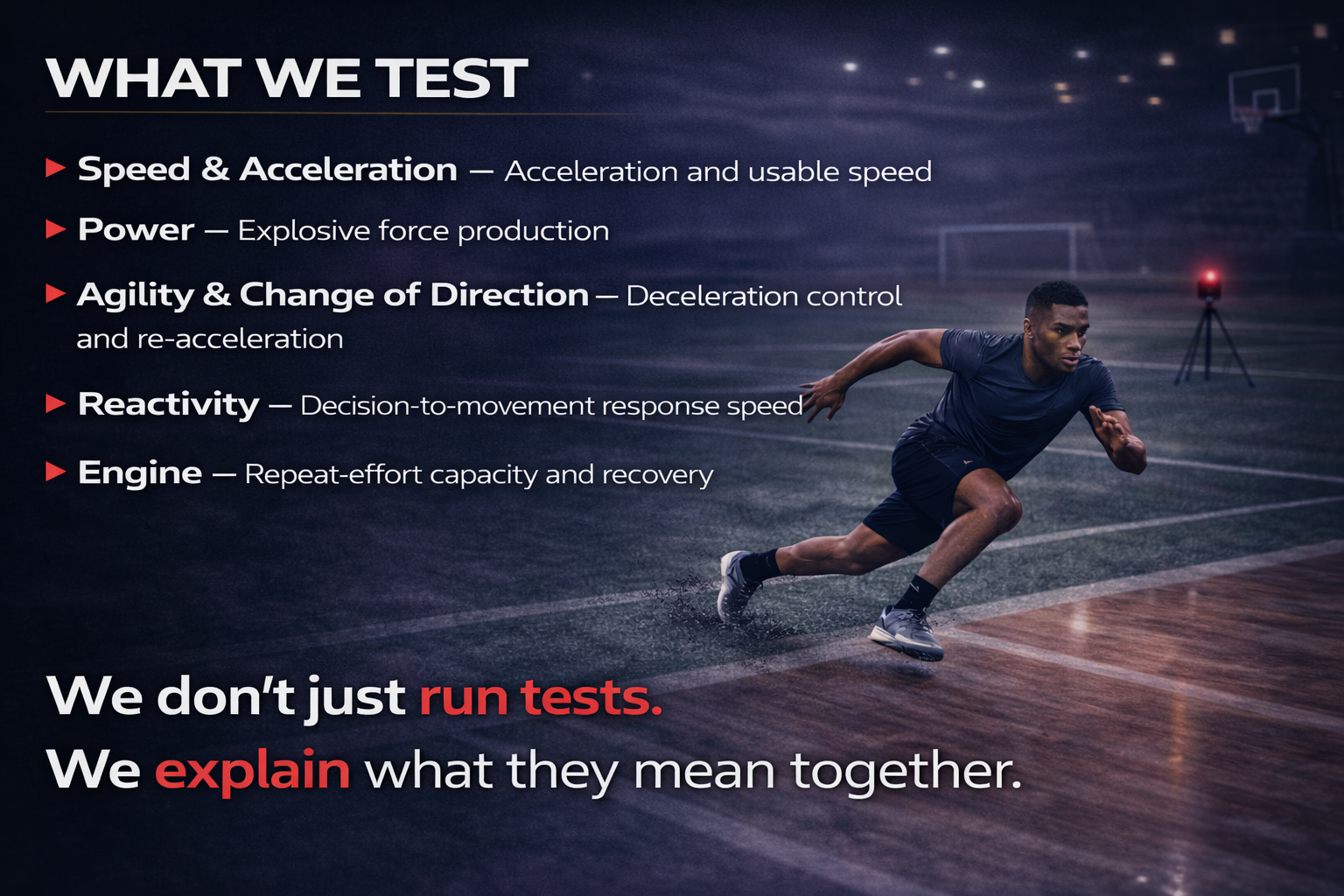 We measure core athletic traits that transfer across sports, including:
