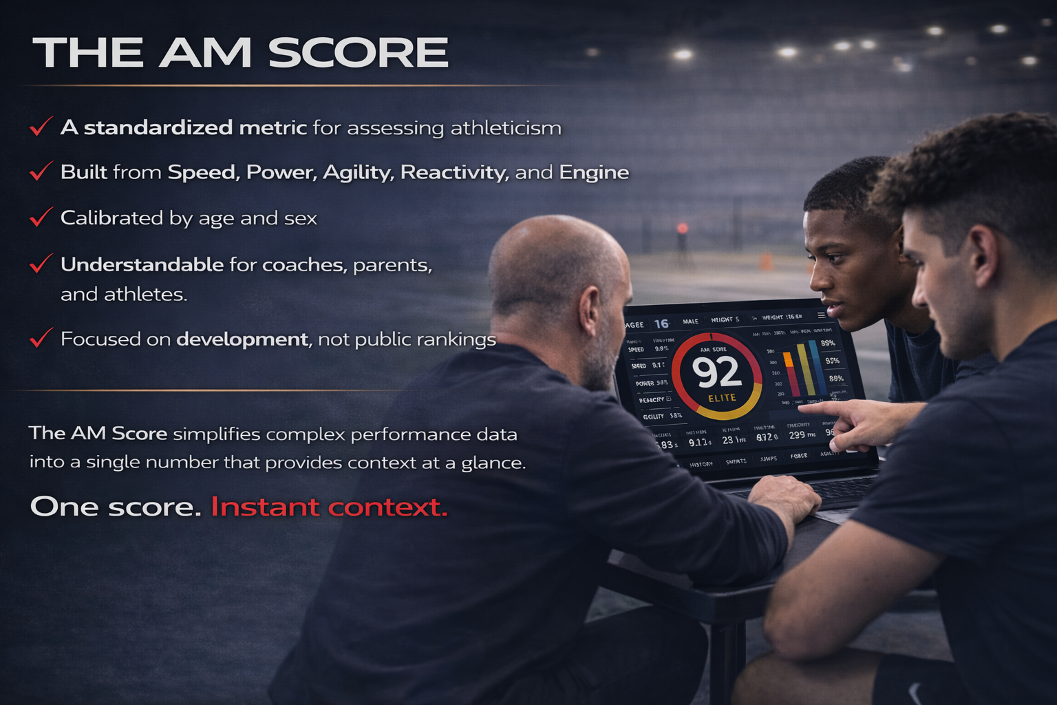 The AM Score (0–100) is a universal measure of athleticism derived entirely from objective testing data. It summarizes an athlete’s overall athletic capacity in a single, easy-to-understand score.
